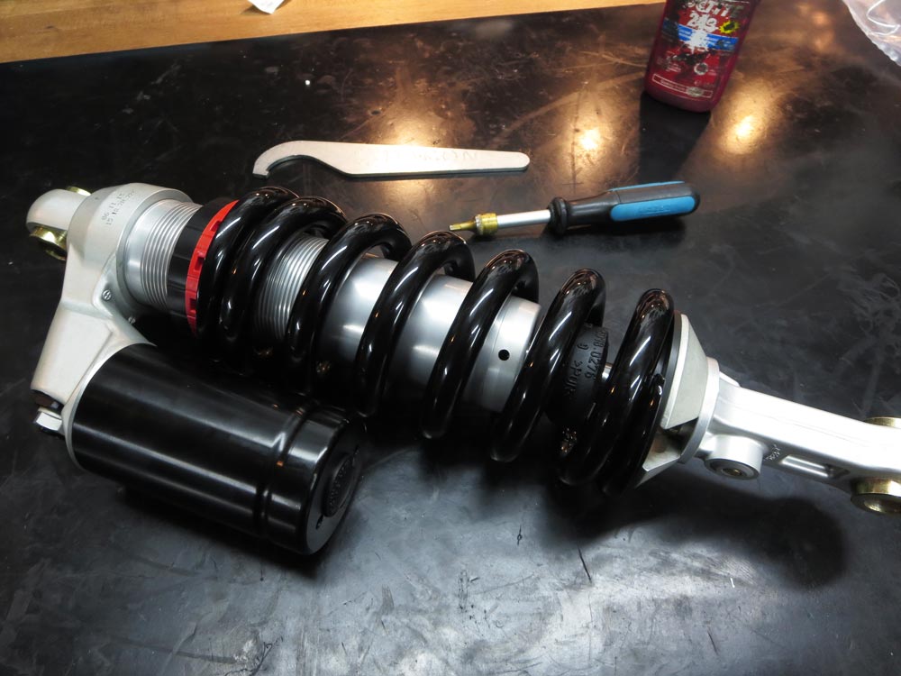 Weißes Federbein gefällt mir überhaupt nicht, deswegen wird das jetzt noch chemisch entlackt und schwarz glänzend beschichtet.