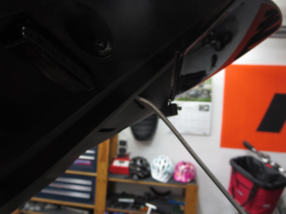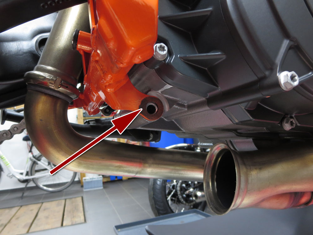 Zum Ausbau mußte den Endtopf weg, was bei der 1290 sehr schnell geht, der ist nicht verschraubt nur gesteckt.Dabei ist mir aufgefallen, dass unten eine Lasche am Rahmen ist und ein passender Anguß im Motor, nur keine Schraube!!!